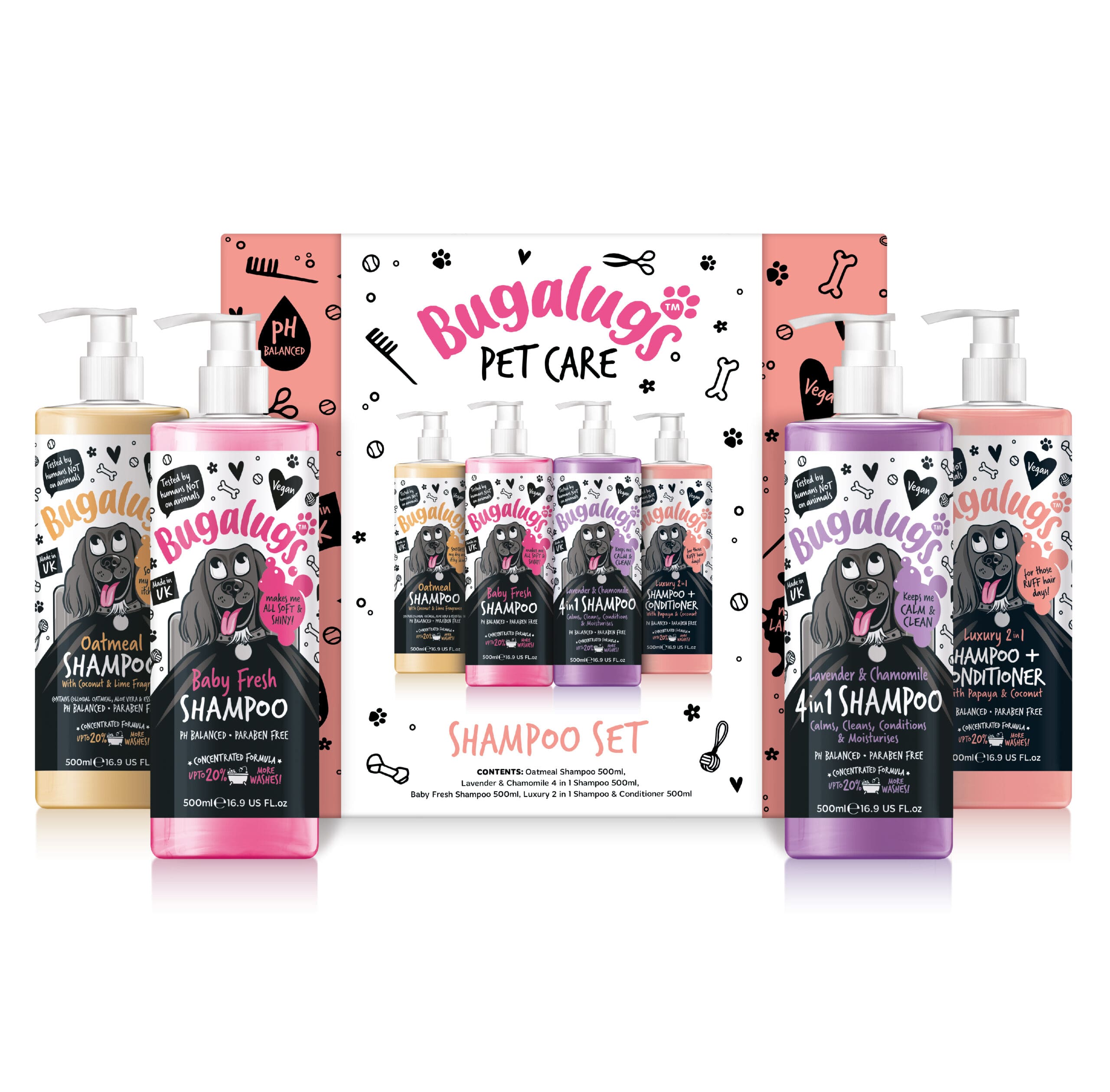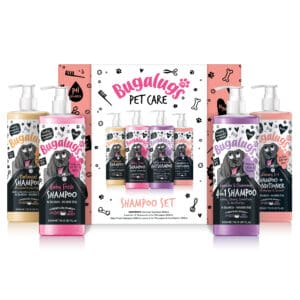 Voor pups die graag lekker ruiken! Onze vier bestverkochte shampoos van 500 ml, verpakt in een Bugalugs-merkdoos.