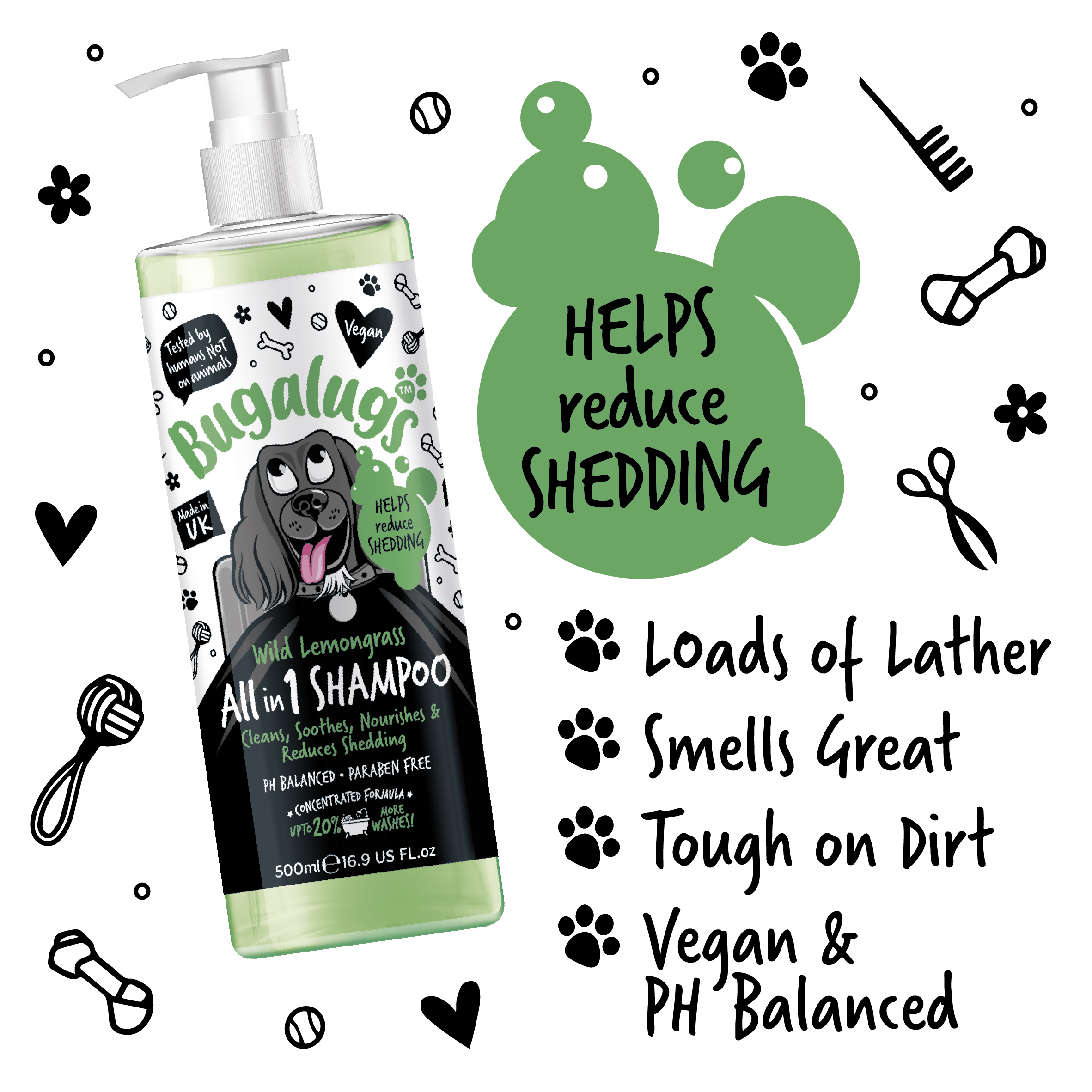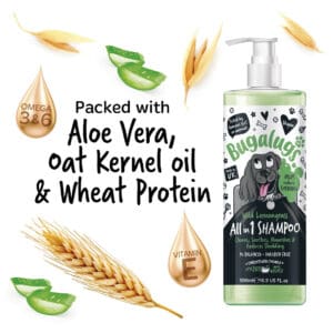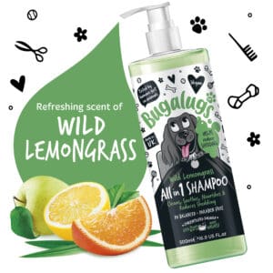 Bugalugs wild lemongrass All in 1 hondenshampoo reinigt, verzacht, voedt en vermindert verharing met een langdurige geur van wild citroengras.