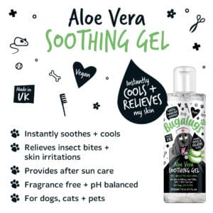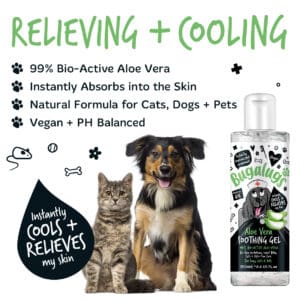 Bugalugs Aloë Vera Soothing Gel voor katten, honden en andere huisdieren, bevat 99% puur aloë vera-sap om de geïrriteerde huid van uw huisdier te kalmeren, voeden, hydrateren en hydrateren. De natuurlijke verkoelende eigenschappen van de aloë vera zorgen voor een effectieve aftersunverzorging en verzorgen ook steken, kleine snijwonden en insectenbeten, waaronder die van vlooien en teken.