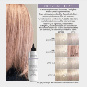 De unieke gel textuur druppelt niet en zorgt voor comfortabele, snelle toepassing. De Instant Coulouring Fluid van FarmaVita Amethyste is direct klaar voor gebruik en heeft geen developer nodig. De Instant Coulouring Fluid is verkrijgbaar in meerdere kleuren. Frozen Lilac is een elegante, koele lila tint die ideaal is om ongwenste warmte te neutraliseren en subtiele lila tinten toe te voegen. Hoe lichter het haar, hoe feller het resultaat. Frozen Lilac is vooral geschikt voor lichte haarkleuren of recent geblondeerd haar. FarmaVita Amethyste Instant Colouring Fluid is vrij van ammonia, PPD/PTD en MEA en lift de natuurlijke haarkleur niet op.