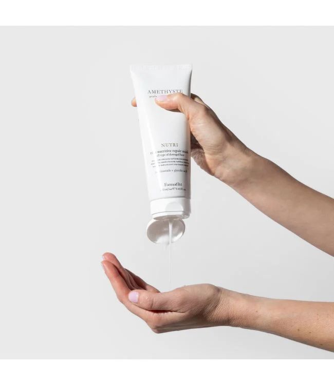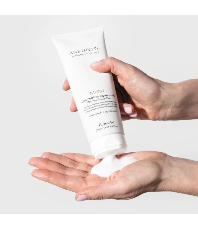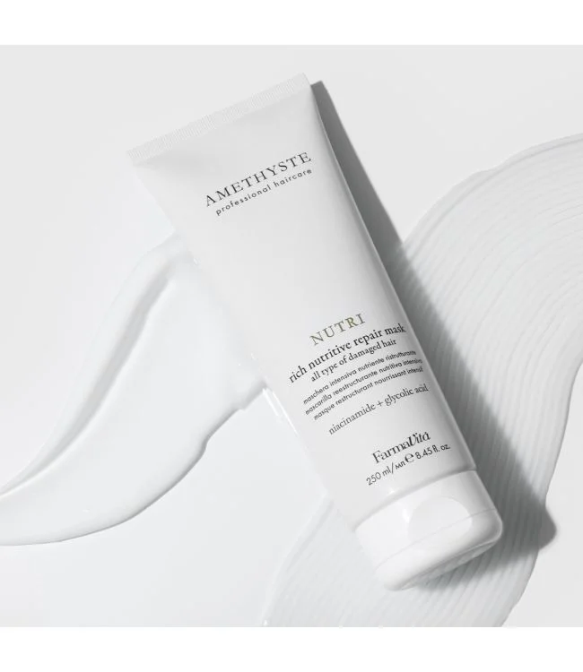 FarmaVita Amethyste Nutri Rich Nutritive Repair Masker 250ml is een verzorgend en herstellend haarmasker voor beschadigd haar. Het haarmasker is verrijkt met Niacinamide + Glycolic Acid om de haarstructuur te repareren en versterken, waardoor het haar weer zacht en glanzend wordt. FarmaVita Amethyste Nutri is geschikt om alle soorten droog en beschadigd haar te verstellen over de gehele lengtes tot in de puntjes.