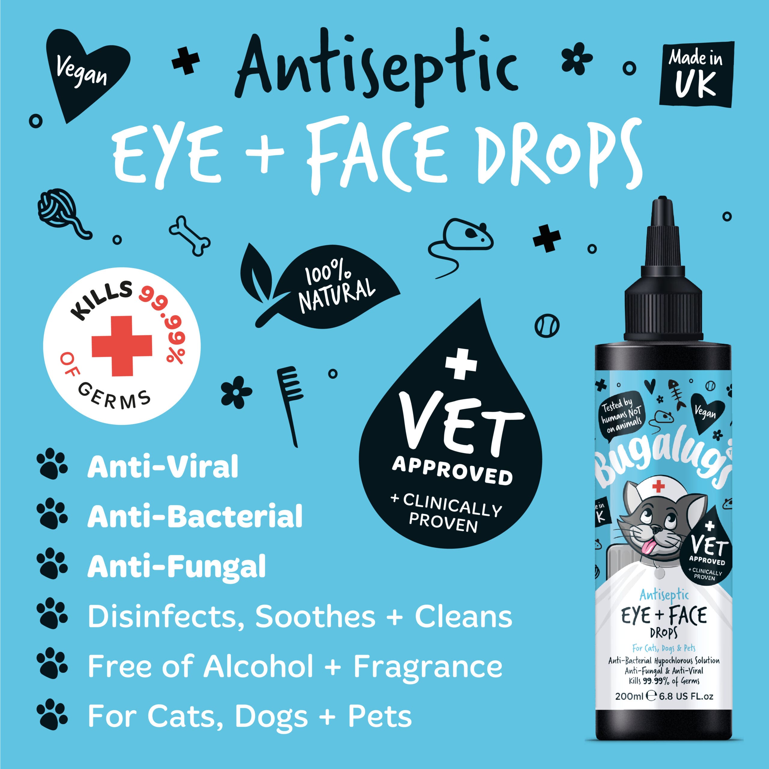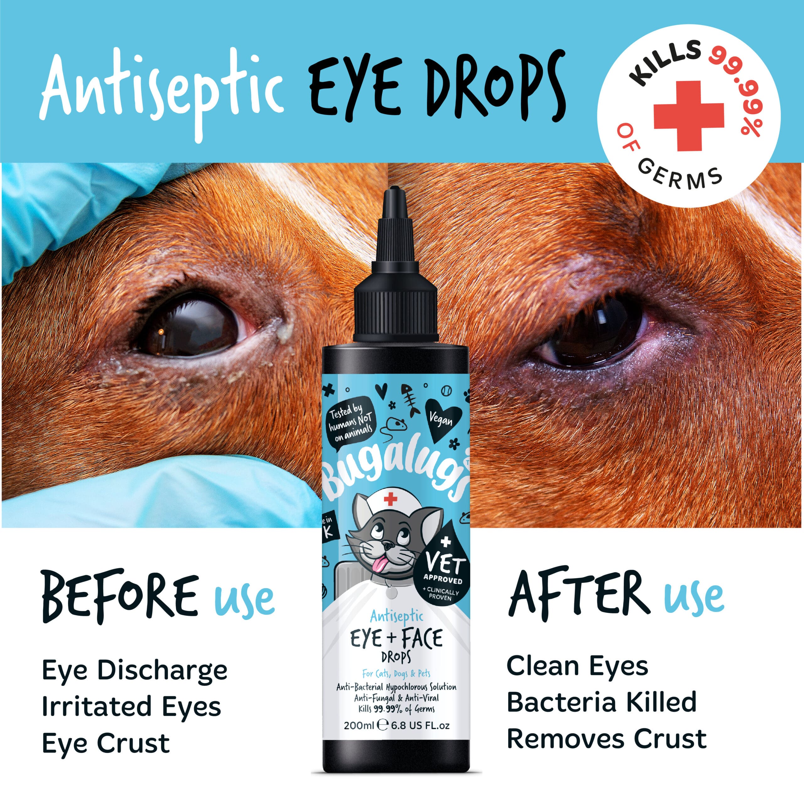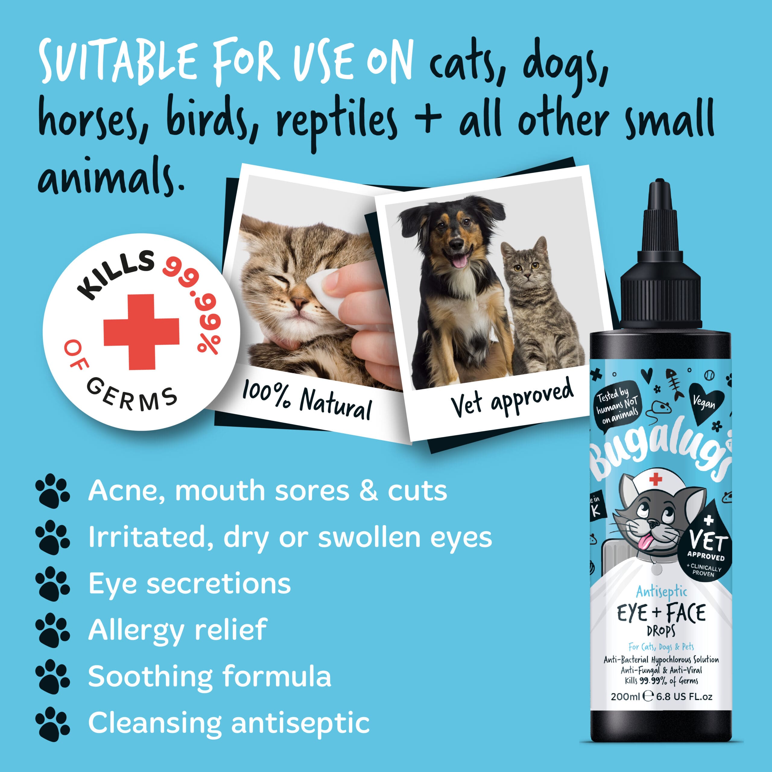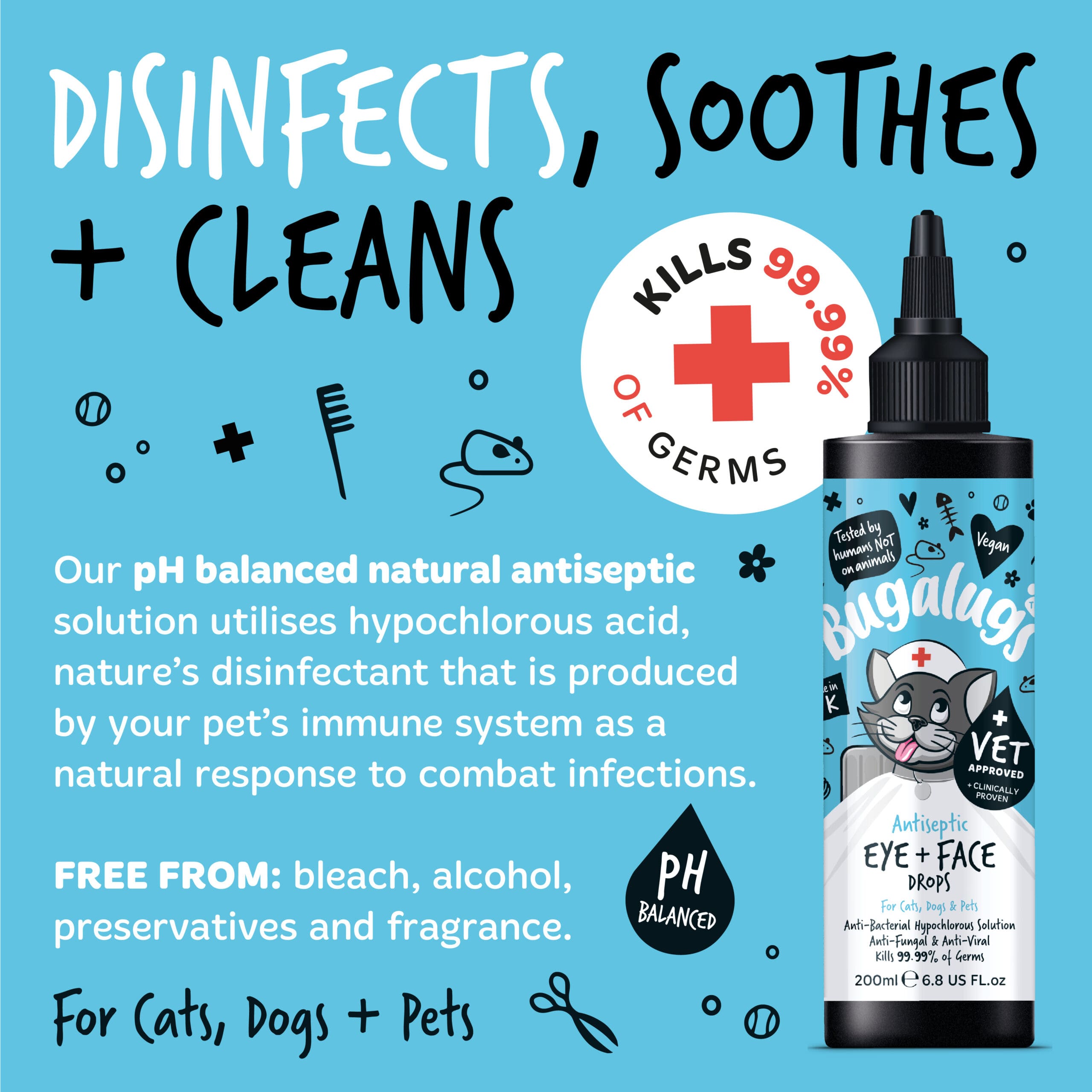 Spoel irriterende stoffen voor de ogen weg met Bugalugs antiseptische oogdruppels. Deze geavanceerde oplossing maakt gebruik van hypochloorzuur om de ogen van uw huisdier te verzorgen.