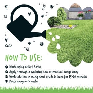 Kunstmatige Gras & Patio Reiniger is een krachtig 3-in-1 desinfectiemiddel, geurverwijderaar en reiniger die u direct resultaat geeft, schadelijke bacteriën en diepe vlekken verwijdert en geuren neutraliseert die specifiek zijn voor de kleine verrassingen van uw huisdier, terwijl het ook nog eens diervriendelijk is.