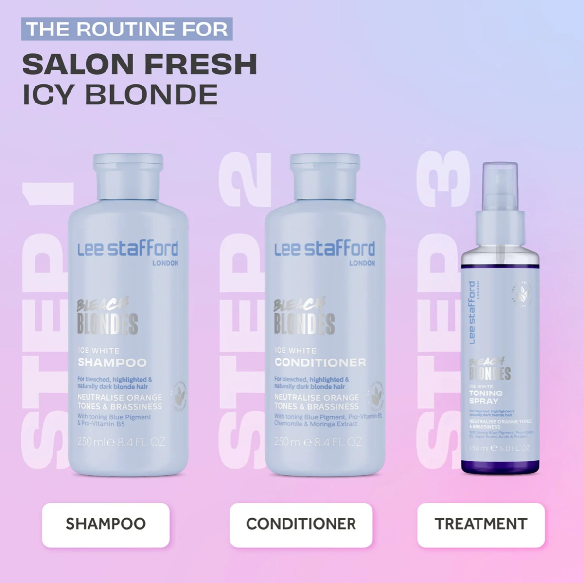 Lee Stafford Bleach Blondes Ice White Toning Spray is een leave in conditioner welke speciaal ontwikkeld is voor blond en geblondeerd haar. Wanneer je net van de kapper komt zien jouw blonde lokken er altijd super mooi uit, maar na verloop van tijd kunnen ze geler worden. Deze spray bevat paarse pigmenten welke de gele gloed neutraliseren en je blonde lokken laten stralen.