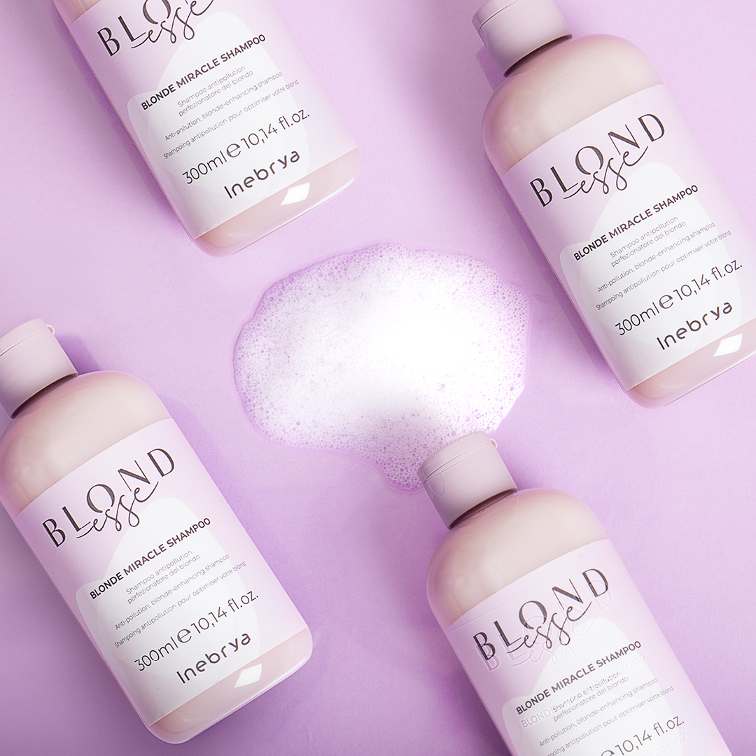 Blondesse BLONDE MIRACLE reinigende en voedende behandelingen bevatten specifieke actieve ingrediënten om blonde nuances te beschermen tegen de schadelijke effecten van smog, fijne deeltjes en UV-stralen. De actieve ingrediënten werken op de haarschubbenlaag als echte schermen die het beschermen tegen externe factoren die de structuur van beschadigd haar aantasten. Door ze in de salon en thuis te gebruiken, wordt de technische behandeling in balans gebracht, wat leidt tot een gezonde en glanzende haarvezel.