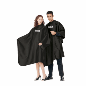 De Wahl Cuttingcape – Black Silver is een uitstekende keuze voor professionele salons, waarbij functionaliteit en stijl samenkomen. Deze zwarte kapmantel van Wahl, verfraaid met een zilveren Wahl-logo, straalt klasse uit en past perfect in de moderne salon.