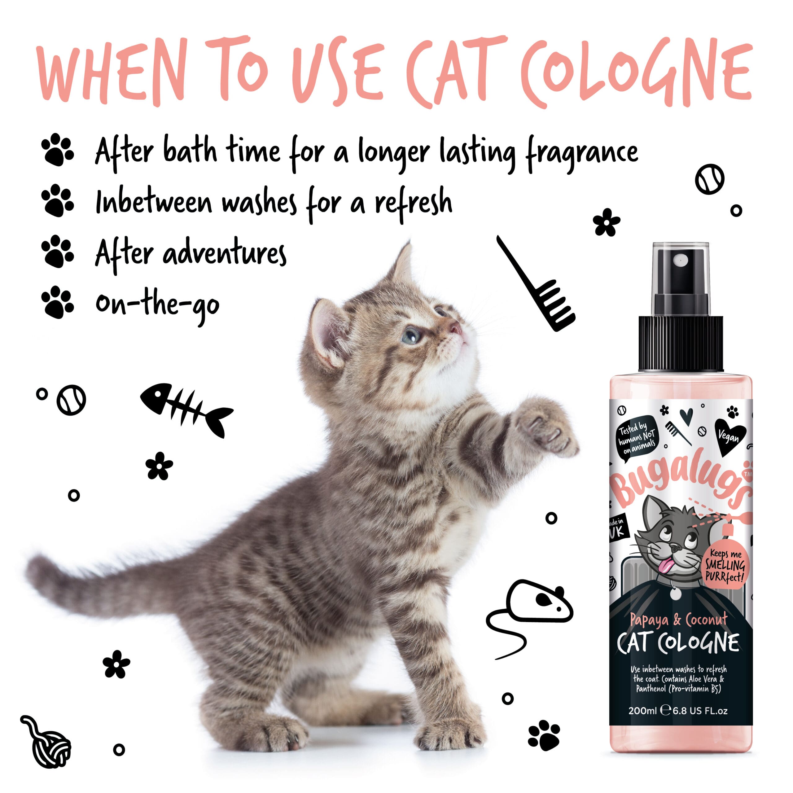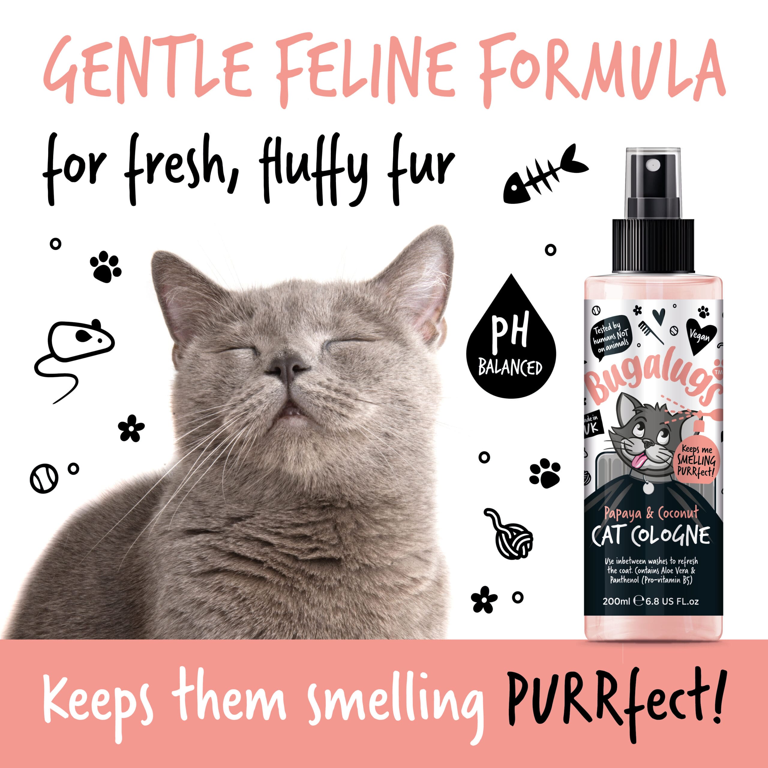 Verfris de vacht snel tussen wasbeurten door met de Bugalugs Papaya & Coconut Cat Cologne!