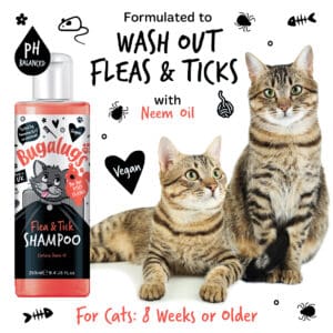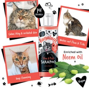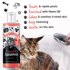 Zeg vaarwel vervelende vrienden met Bugalugs, onze gloednieuwe shampoo zonder spoelen is verrijkt met neemolie en is niet alleen veilig en effectief voor zowel honden als katten, maar helpt ook bij het behouden van een gezonde vacht terwijl het de geïrriteerde huid kalmeert en verzacht.