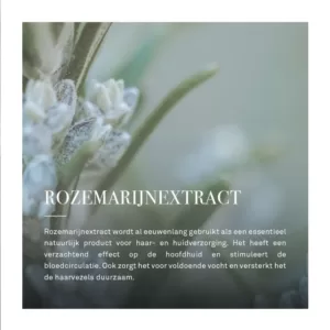 Rozemarijnextracten worden al eeuwenlang gebruikt als een essentieel natuurlijk product voor haar- en huidverzorging. Rozemarijn heeft een kalmerende werking op de hoofdhuid en stimuleert tegelijkertijd de bloedsomloop. Het zorgt ook voor voldoende vocht en versterkt de haarvezels duurzaam.