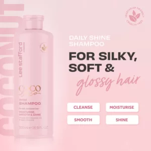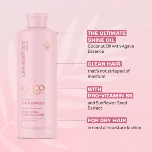 “Lee Stafford CoCo LoCo & Agave Shine Shampoo is een shampoo tjokvol voordelen van kokos & Agave. Droog en beschadigd haar? Dit is de eerste stap naar een zijdezachte en glanzende coupe. Deze shampoo is de ultieme reiniging en voeding van jouw lokken en zorgt voor een schitterende glans. Het ingrediënt kokosolie levert essentiële eiwitten welke ervoor zorgen dat beschadigd haar gevoed wordt en zich weer herstelt. Je haar wordt intens gehydrateerd en beschermd waardoor breuken aanzienlijk verminderen. Naast kokos, bevat deze shampoo nu ook Agave voor extra voeding, beweging en een oogverblindende glans.