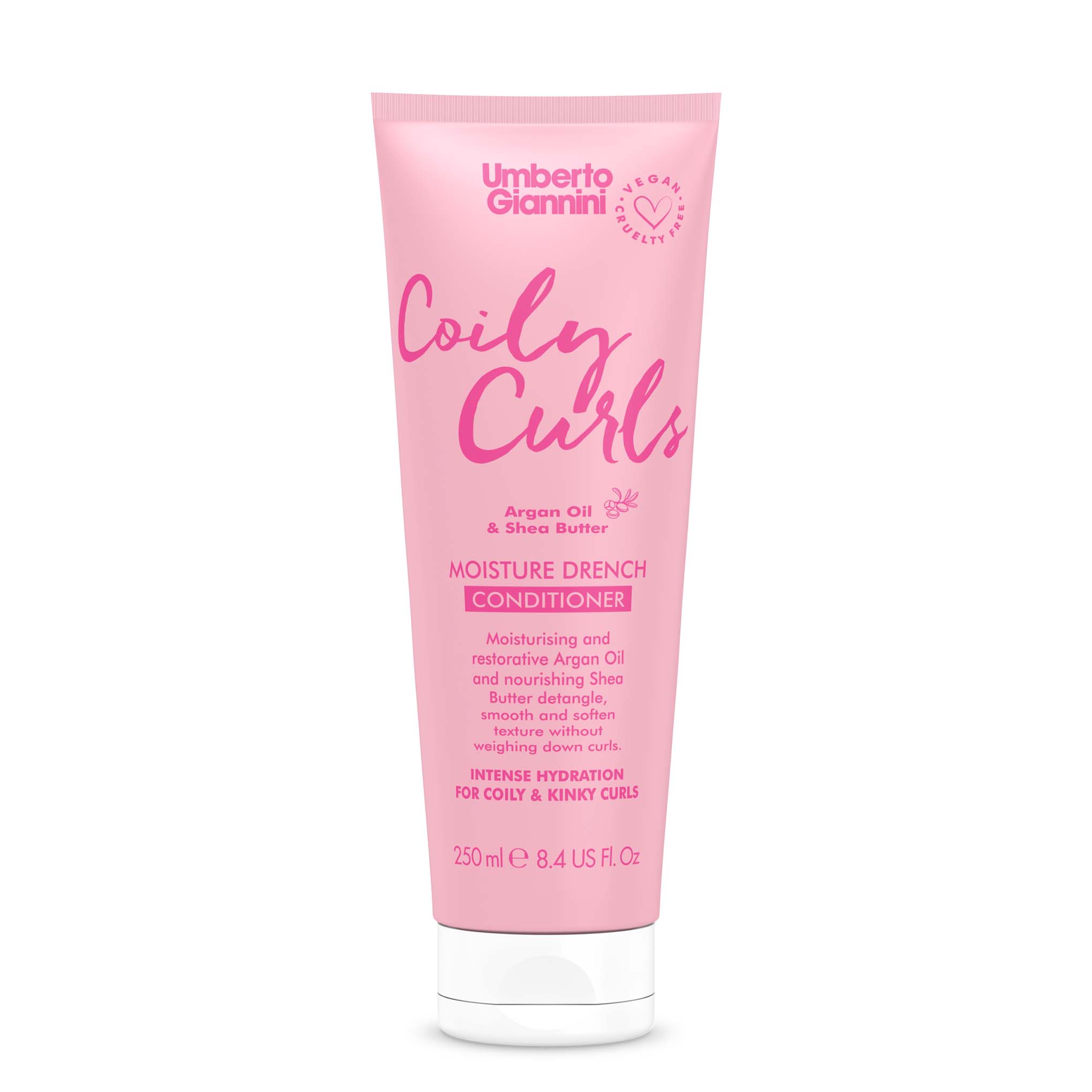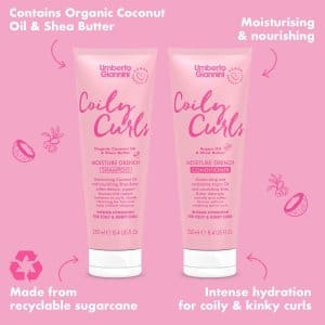De Umberto Giannini Coily Curls Moisture Drench Conditioner is een vegan herstellende conditioner voor krullend haar. Met deze conditioner worden jouw krullen intents gevoed en gehydrateerd. De krul wordt verbetert met als resultaat gezonde, gedefinieerde krullen. De toevoeging van sheaboter en argan olie verzachten het haar en geven een zijdezachte finish zonder pluis.
