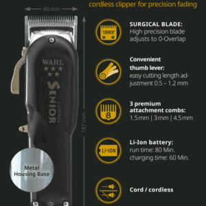 De Wahl Cordless Senior Tondeuse is het meest vertrouwde en tevens oudste gesnoerde Wahl, bezit de krachtigste motor van alle draadloze tondeuses en genereert een hogere scheersnelheid en snijcapaciteit.