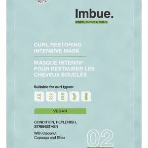 IMBUE. Curl Restoring Intensive Mask is een intensief, voedend haarmasker speciaal ontwikkeld voor krullen, coils & kinks van 3A tot en met 4C. Blaas opnieuw leven in uw krullen dankzij dit eiwitrijke masker dat beschadigd haar voedt en behandelt.