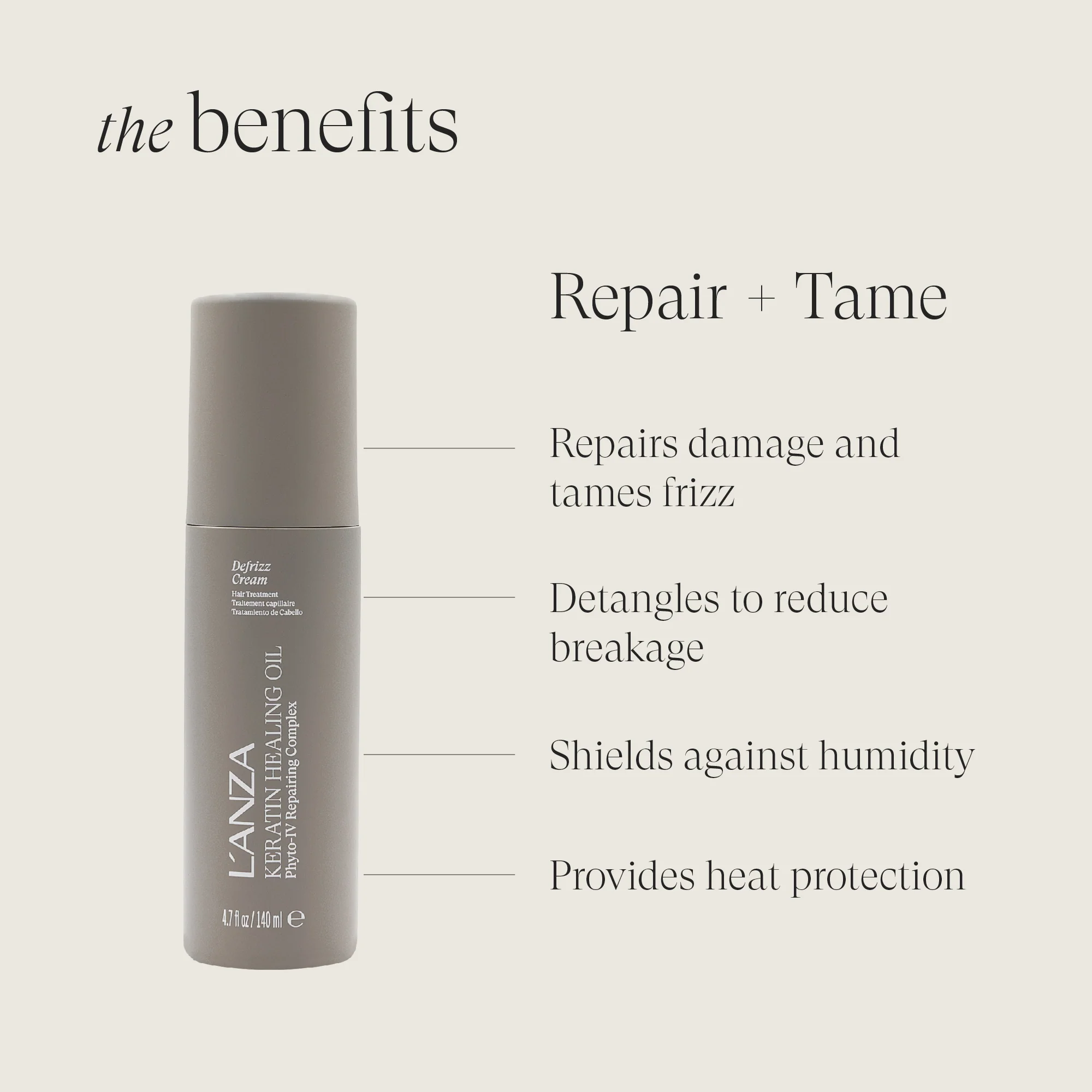 Deze gebruiksvriendelijke, ontwarrende crème maakt gebruik van cuticelbinding om de wrijving tijdens het kammen te verminderen, waardoor beschadiging en pluis worden voorkomen. Defrizz Cream is ideaal voor golvend en krullend haar, blokkeert vocht en maakt het haar gladder en glanzender. Vermindert poreusheid en beschermt zo tegen luchtvochtigheid. Ontwart en ontklit onhandelbaar haar.