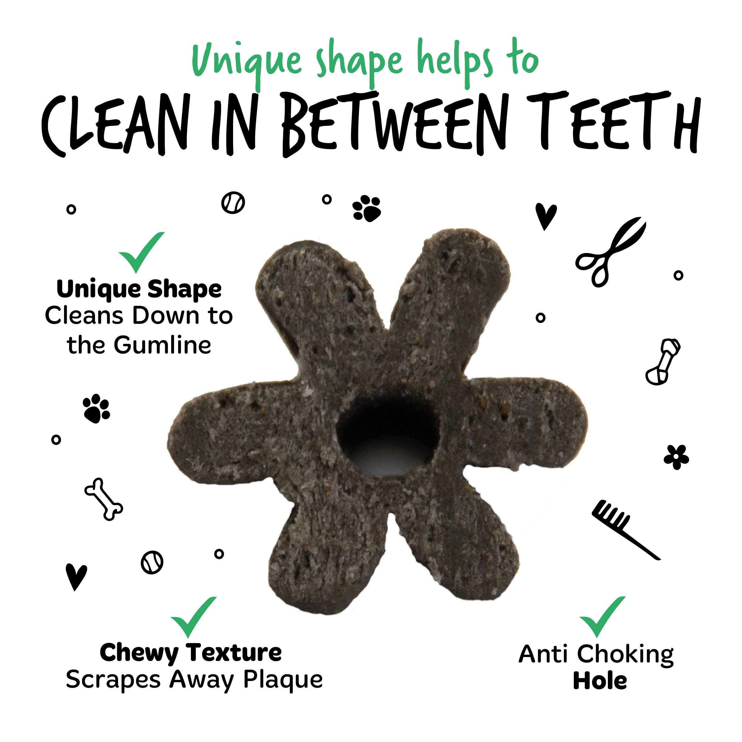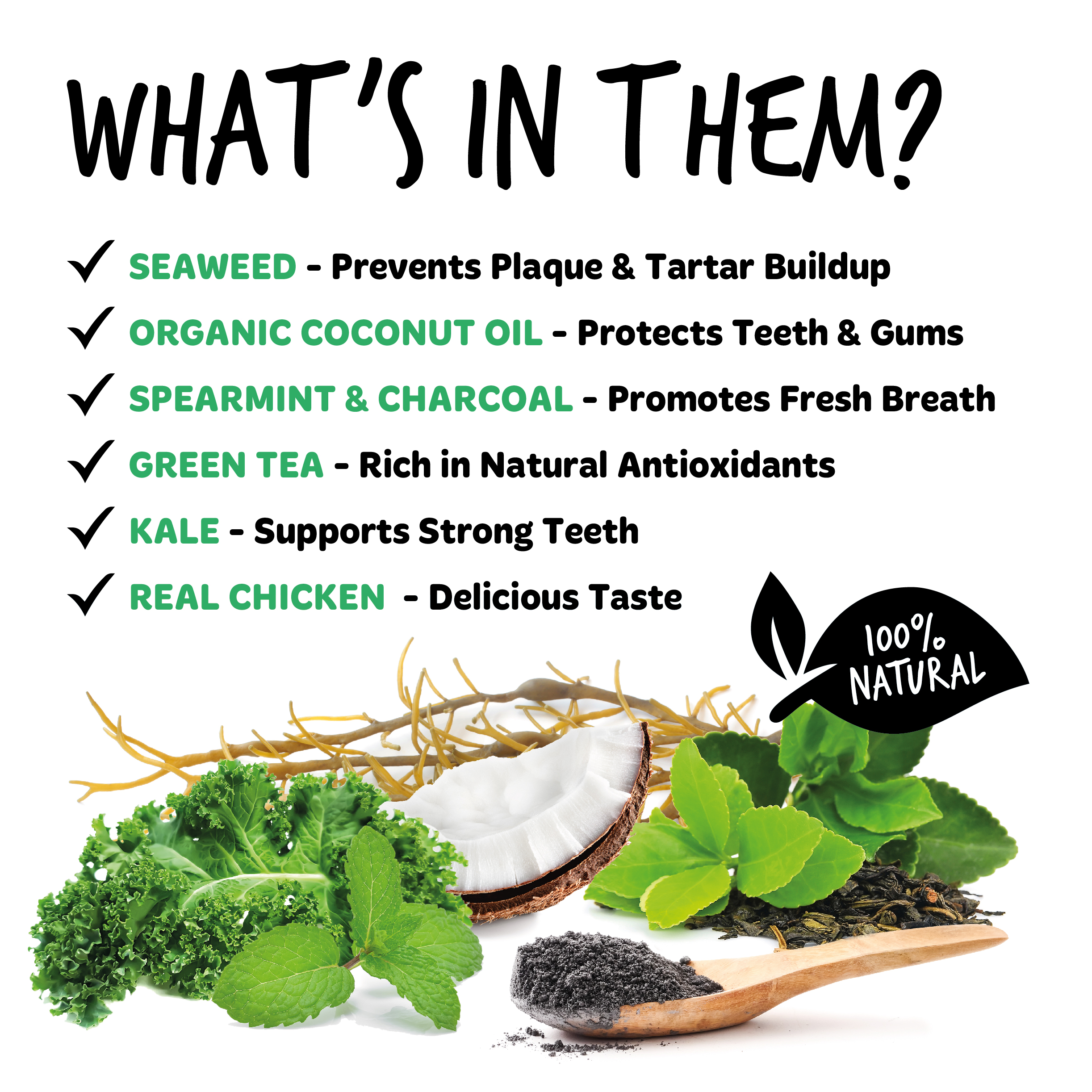 Verrijkt met 100% natuurlijk, met de hand geoogst Iers zeewier Ascophyllum Nodosum, helpt elke stick tandplak en tandsteen te voorkomen. Boerenkool draagt ​​bij aan sterke tanden, terwijl houtskool en groene munt zorgen voor een frisse adem. Biologische kokosolie en groene thee leveren essentiële, gezonde vetten en natuurlijke antioxidanten, ter ondersteuning van het algehele welzijn van uw hond.