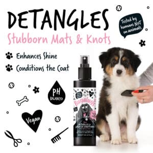 Onze spray met frambozen- en citroengeur maakt de vacht van je hond zijdezacht en glad, geeft glans en ontwart hardnekkige knopen en klitten.
