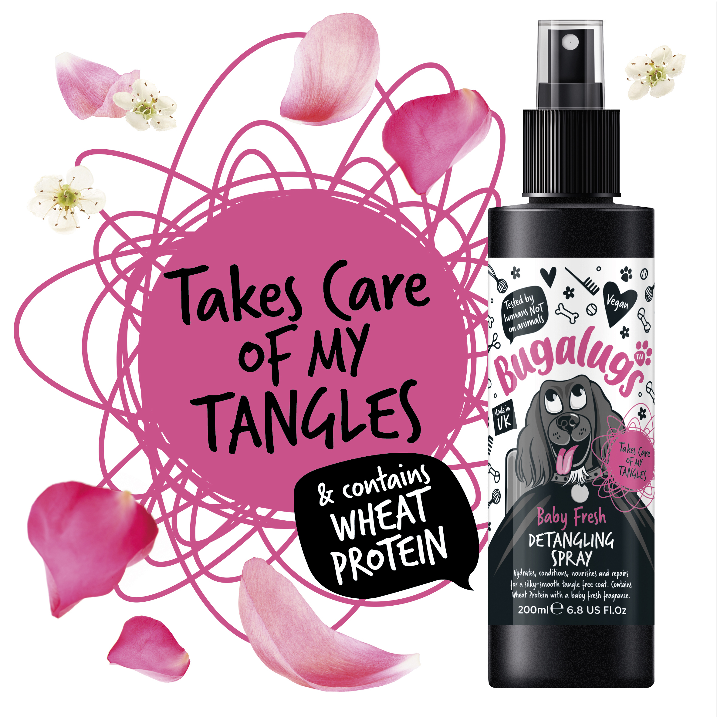 De Baby Fresh detangling spray van Bugalugs is een anti-klitspray voor honden die helpt om hardnekkige knopen en klitten uit de vacht van je hond te verwijderen. De spray is aangenaam geparfumeerd met de nostalgische geur van babypoeder. De veganistische PH-neutrale formule bevat tarweproteïne dat diep in het haar van je hond doordringt en het herstel, de herstructurering en de bescherming van binnenuit bevordert. Tarweproteïne maakt de vacht zijdezacht en laat een beschermende laag achter die de vacht beschermt tegen dagelijkse invloeden. Bij regelmatig gebruik kan de spray ook verdere klitten voorkomen. De Baby Fresh anti-klitspray kan zowel op droog als op nat haar worden toegepast en is geschikt voor alle hondenrassen. Daarnaast kan de spray ook worden gebruikt bij katten en paarden.