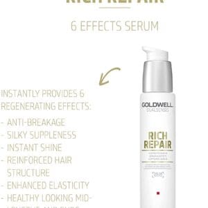 Het Goldwell Dualsenses Rich Repair 6 Effects Serum reconstrueert het haar direct en geeft souplesse en glans. De spray verminderd de haarbreuk en zorgt voor gezonde haarpunten. Het IntraLipid Complex herstelt het haar van binnenuit en vult de lipiden effectief en diep aan voor gezond, zacht haar met directe glans.