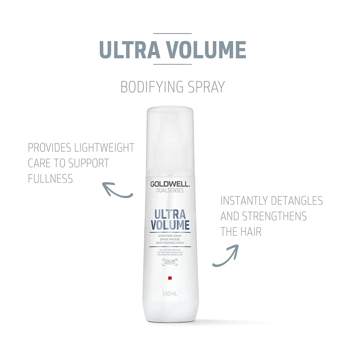 Goldwell DualSenses Ultra Volume Bodifying Spray bevat Fade Stop Formula wat kleurverlies reduceert tot een minimum. De ultrafijne spraynevel verspreidt het product goed over het haar voor versteviging en extra houdbaarheid.