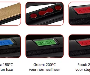 • Temperatuurselectie voor fijn haar (groen), normaal en gekruld haar (blauw) en stug en weerbarstig haar (rood)