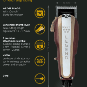 Professionele tondeuse uit de Wahl Five star serie en is voorzien van een V9000 motor waardoor er minder trillingen ontstaan en de motor minder warm wordt.
