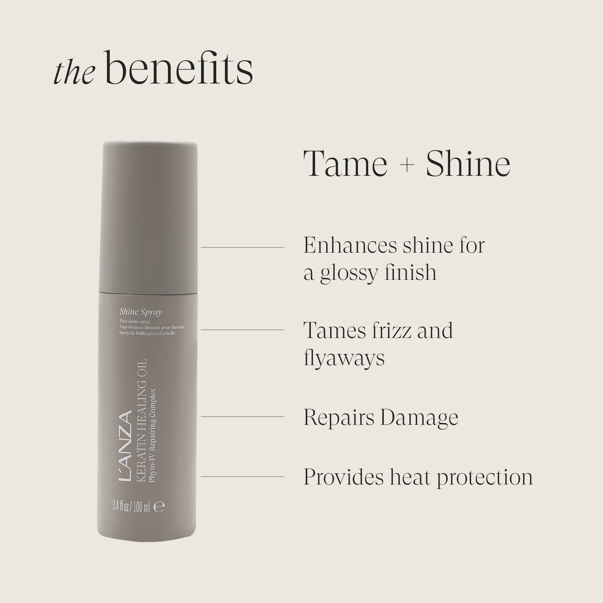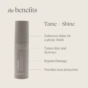 Een gemicroniseerde fijne nevelspray die een unieke botanische mix bevat die gewichtloze glans geeft aan elk haartype.