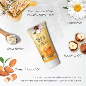 Gevuld met meer dan 10 huidvriendelijke natuurlijke ingrediënten, zal deze snel absorberende hand- en nagelcrème je voorzien van geconditioneerde nagelriemen en zijdezachte handen. Bevat premium gecertificeerde Manuka Honing 80+ vermengd met Prosina, een gehydrolyseerde keratine afgeleid van Nieuw-Zeelandse schapenwol. Deze bewezen combinatie verbetert de structuur en sterkte van je nagels terwijl het de hydratatie en zachtheid van je huid en nagelriemen verhoogt. Karitéboter gecombineerd met de oliën van zoete amandel, olijf, hazelnoot en sinaasappelschil zal diep voeden en de elasticiteit en gladheid herstellen. Kamille en Passiebloem helpen vermoeide handen te kalmeren en te kalmeren.