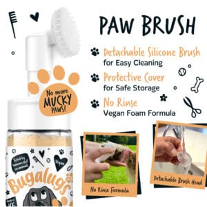 Wat Bugalugs pootreiniger uniek maakt, is onze schuimformule zonder afspoelen. Deze maakt rommelige baden en water overbodig. Dankzij de gebruiksvriendelijke pomp en borstel met schuimwerking pomp je het schuim eenvoudig op de borstel en breng je het direct op de poten aan – zo eenvoudig is het! Het compacte formaat maakt het ideaal voor onderweg, of je nu gaat wandelen, kamperen of gewoon geniet van een wandeling in de omgeving.