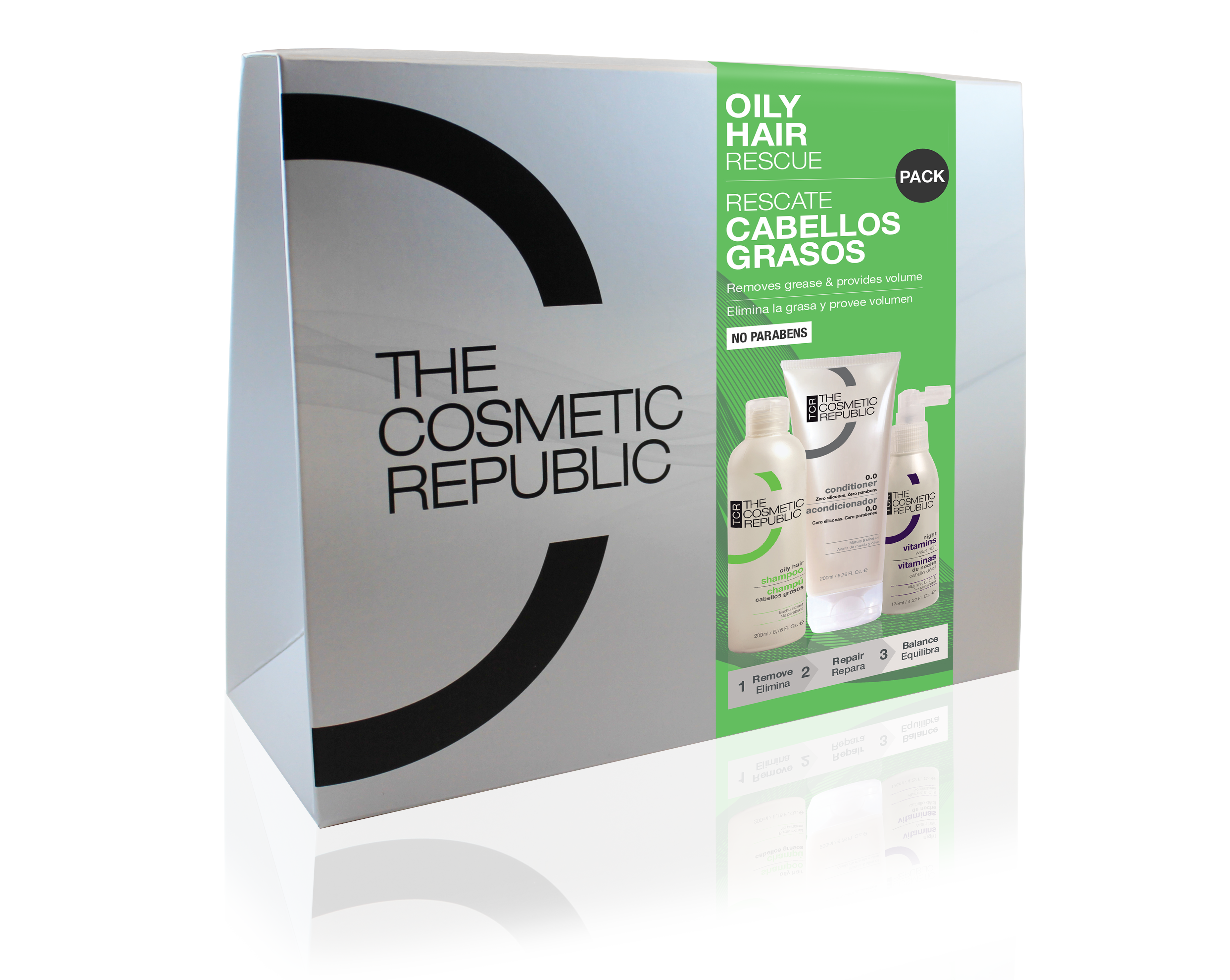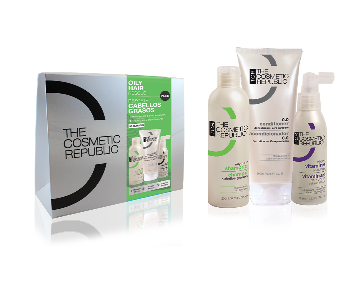 Het Oily Hair Rescue Pack helpt bij het verwijderen van vet en geeft volume en body in 3 stappen.