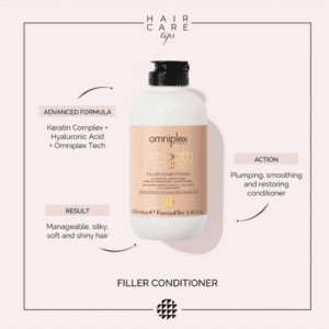 FarmaVita Omniplex Smooth Experience Filler Conditioner 250ml is een herstellende, gladmakende en opvullende conditioner die het haar intensief voedt. De ultra rijke formule herstelt het haar door de vezelstructuur te revitaliseren en te versterken met als resultaat pluisvrij, handelbaar, zijdezacht en glanzend haar. De formule bestaat uit een Vegetal Keratin Complex, Omniplex Technologie en Hyaluronzuur die het haar versterken, beschermen, opvullen en prachtig glad en glanzend maken. De conditioner is zowel geschikt om te gebruiken in de salon als voor thuisverzorging om het effect van de behandeling te versterken.