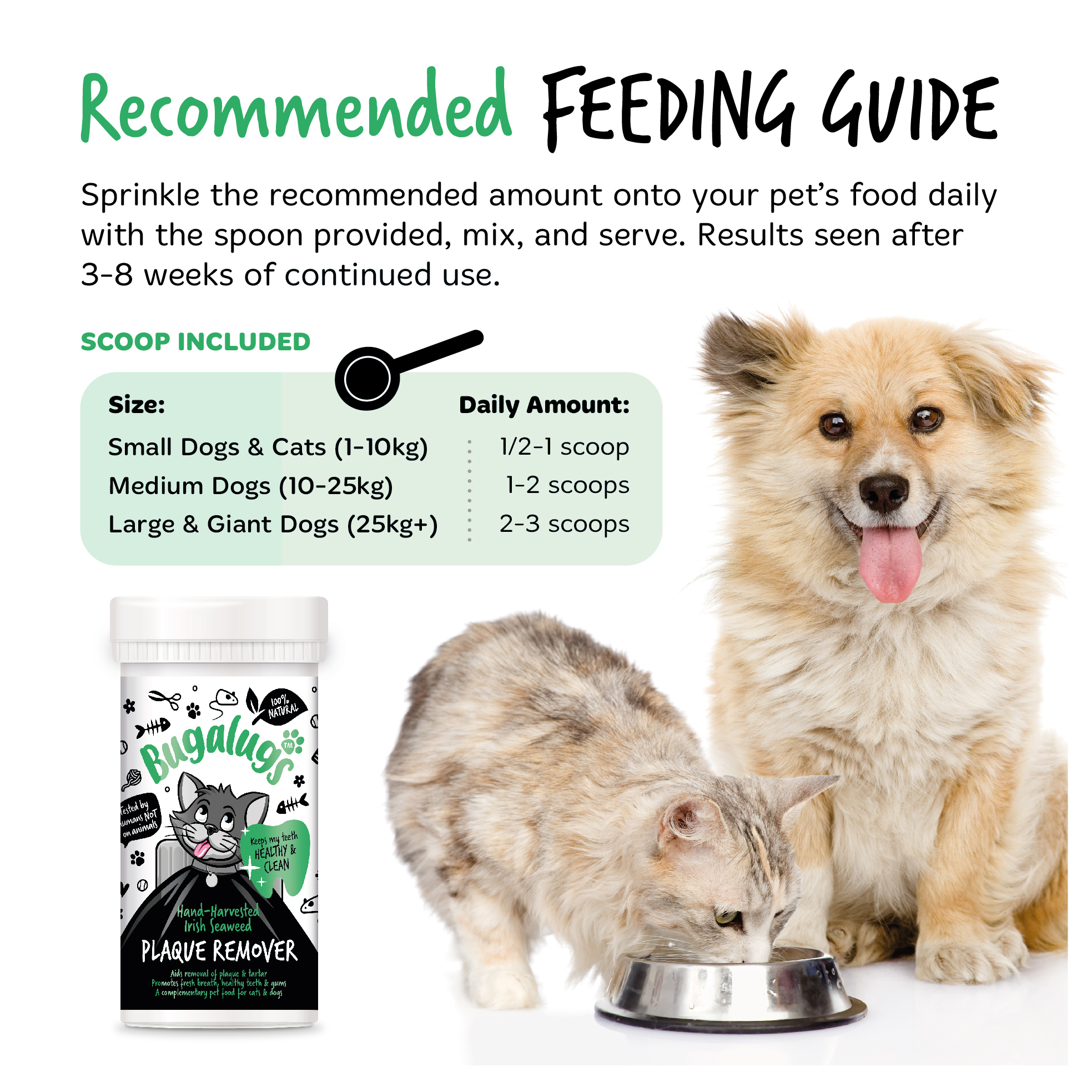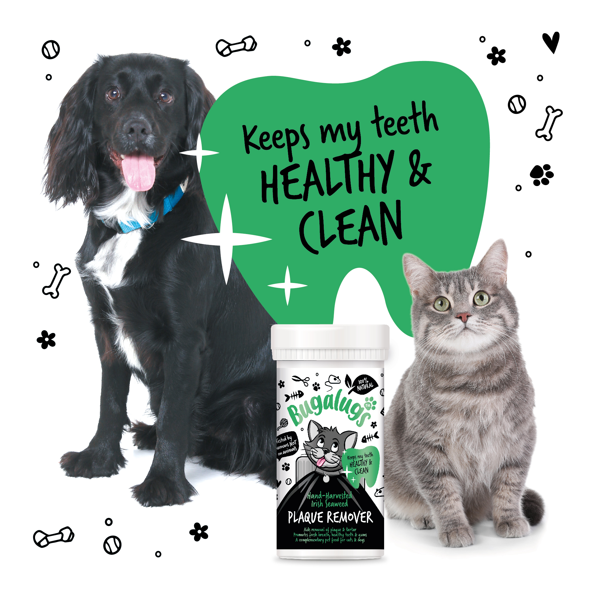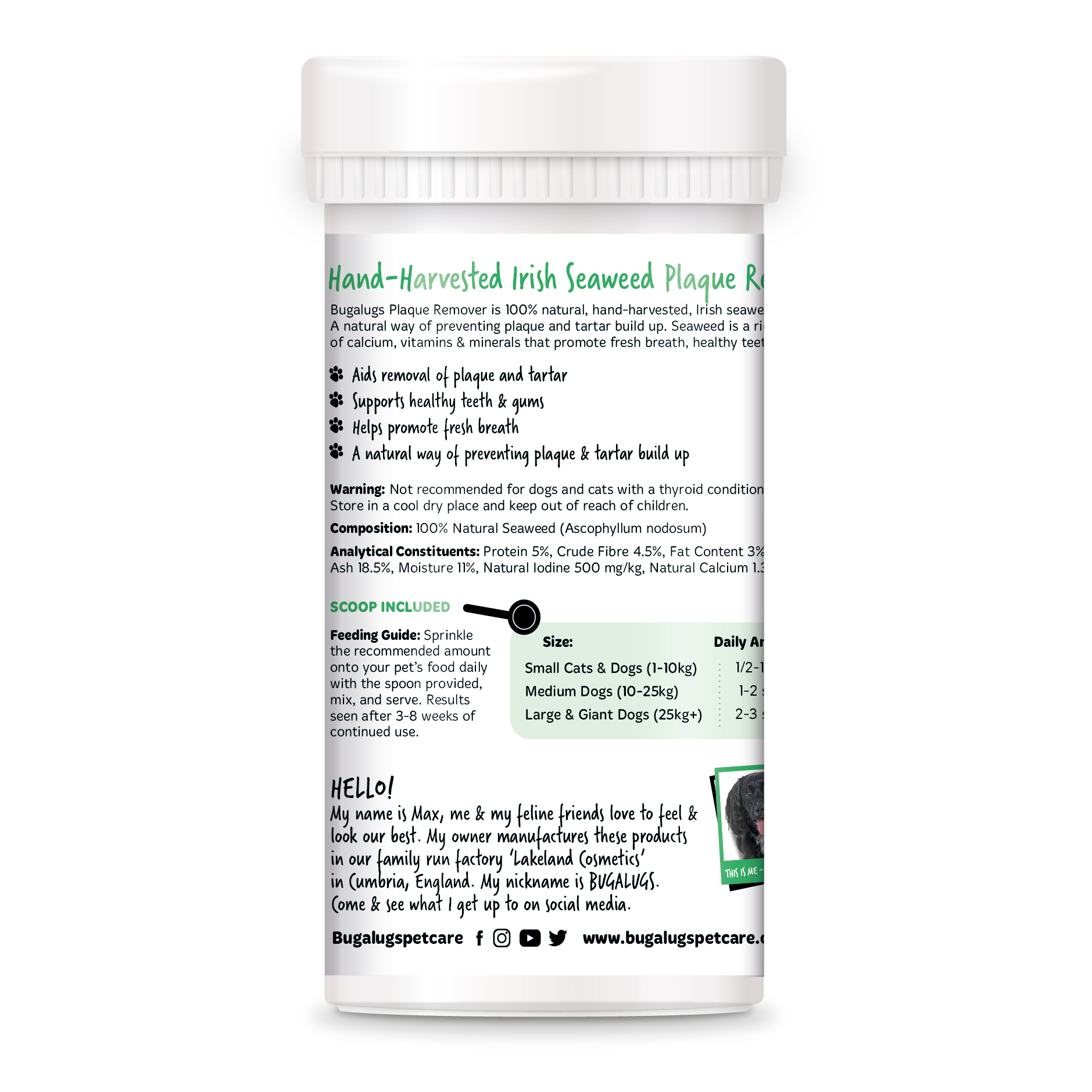 Houd de mondhygiëne van uw huisdier onder controle met Bugalugs Plaque Remover. Dit 100% natuurlijke supplement is gemaakt van met de hand geoogst Iers zeewier en helpt bij het verwijderen van tandplak en tandsteen.