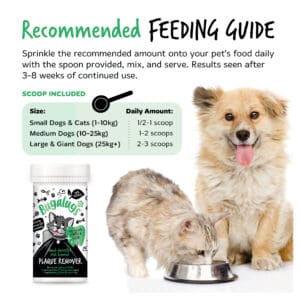 De anti-tandsteenmix is gemaakt van volledig natuurlijke duurzame ingrediënten die dierproefvrij en veilig zijn voor uw huisdier. Strooi gewoon de aanbevolen hoeveelheid in de dagelijkse maaltijd van uw hond met behulp van de meegeleverde lepel om toekomstige ophoping te voorkomen. Zo gemakkelijk en zonder geknoei!