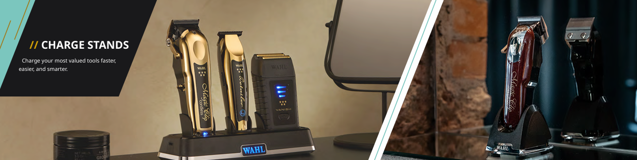 Speciaal ontwikkelde Wahl Charge Stand cordless clipper oplaadstation voor de Wahl draadloze tondeuses. Zo heb jij nu de perfecte georganiseerde werkplek.