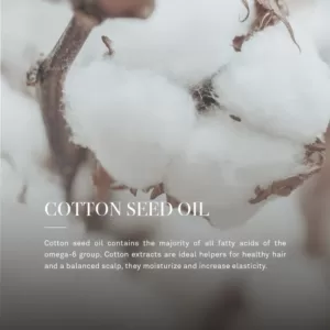Katoenzaadolie bevat het merendeel van alle vetzuren uit de omega-6-groep, waardoor het een ideale verzorgingspartner is voor gekleurd, beschadigd, geblondeerd of poreus haar, maar ook voor droge haartypes. Katoenextracten zijn ideale helpers voor gezond haar en een evenwichtige hoofdhuid, ze hydrateren en verhogen de elasticiteit.