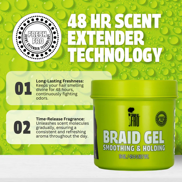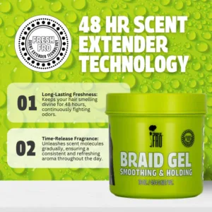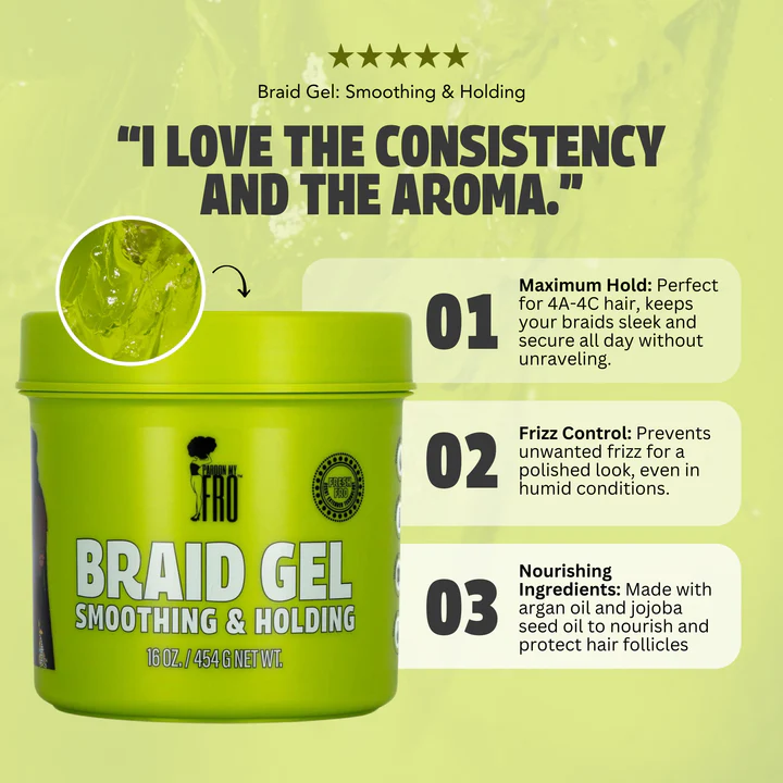 Smoothing & Holding Braid Gel – Fixeert je stijl met een sterke maar flexibele hold. Houdt het haar glad, zacht en pluisvrij, ideaal voor vlechten, twists en strak naar achter gestylede looks zonder schilfers of ophoping.