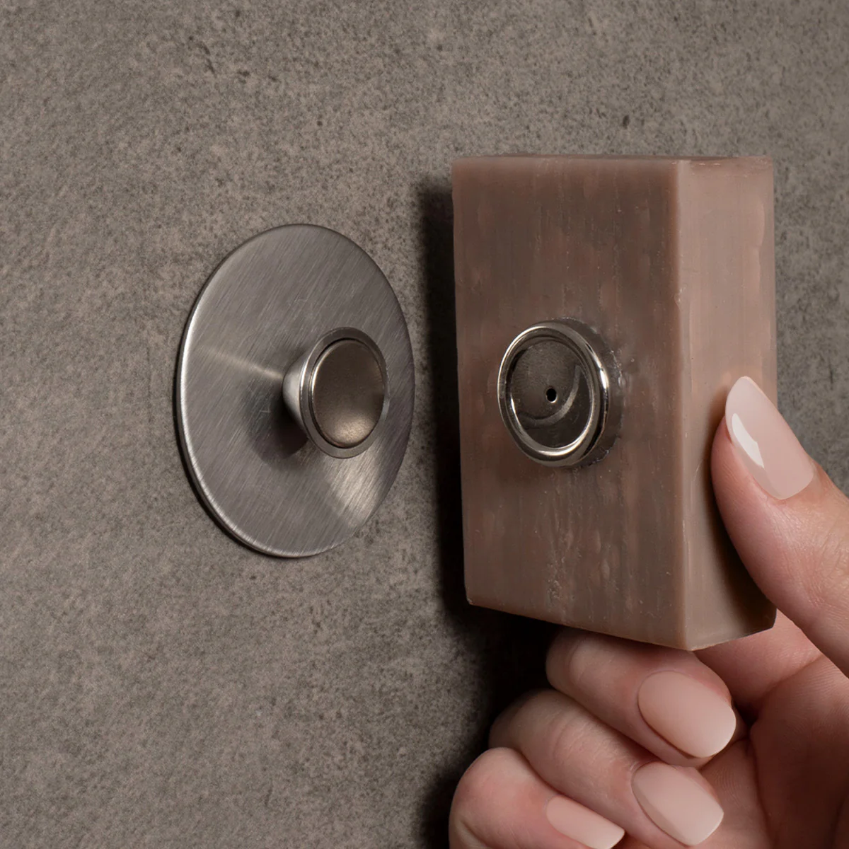 Deze metalen houder is ontwikkeld zodat je je Solid Bar in je badkamer aan de muur kunt ophangen. De houder bestaat uit twee delen: de ene kant duw je in de solid bar, en de andere kant heeft dubbelzijdig tape om aan de muur te bevestigen. Dankzij de magneten die de twee delen met elkaar verbinden, kun je je solid bar met gemak ophangen.
