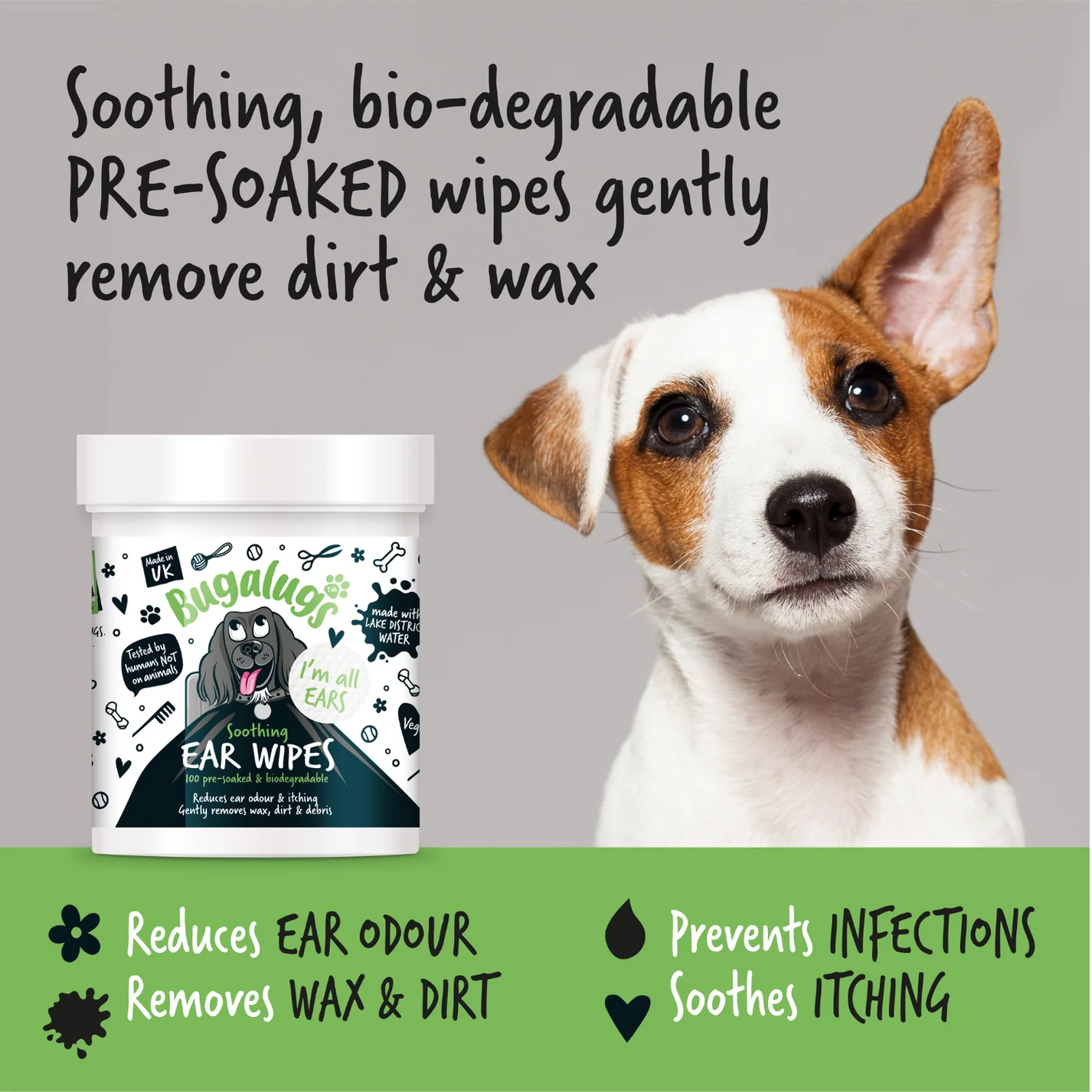 Bugalugs oordoekjes helpen de oren van uw hond schoon en gezond te houden door vuil en oorsmeer op een zachte en effectieve manier weg te vegen met onze natuurlijke formule.