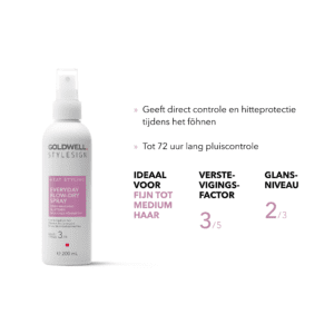 Is perfect voor moeiteloos föhnen en langdurige bescherming van je haar. Deze innovatieve spray vergemakkelijkt het föhnen en beschermt tegelijkertijd je lokken tegen hitte en beschadiging. Dankzij de lichte formule zorgt deze spray voor een professionele afwerking, elke dag opnieuw. Voeg deze spray toe aan je dagelijkse routine voor gezond uitziend haar en een langdurige, glanzende finish.