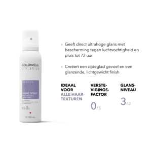 Goldwell Stylesign Shine Spray 150 ml transformeert elke haartextuur onmiddellijk naar een steile, gladde en glanzende look. Geniet van langdurige stijlen die tot 72 uur lang bestand zijn tegen luchtvochtigheid en pluis.