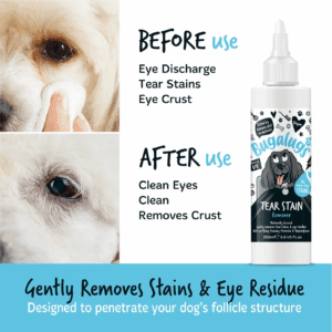 Verwijder traanvlekken en oogresten voorzichtig met Bugalugs New Tear Stain remover voor honden. Deze milde, natuurlijk afgeleide formule is gemaakt met een combinatie van rustgevende teunisbloem en passiebloem.