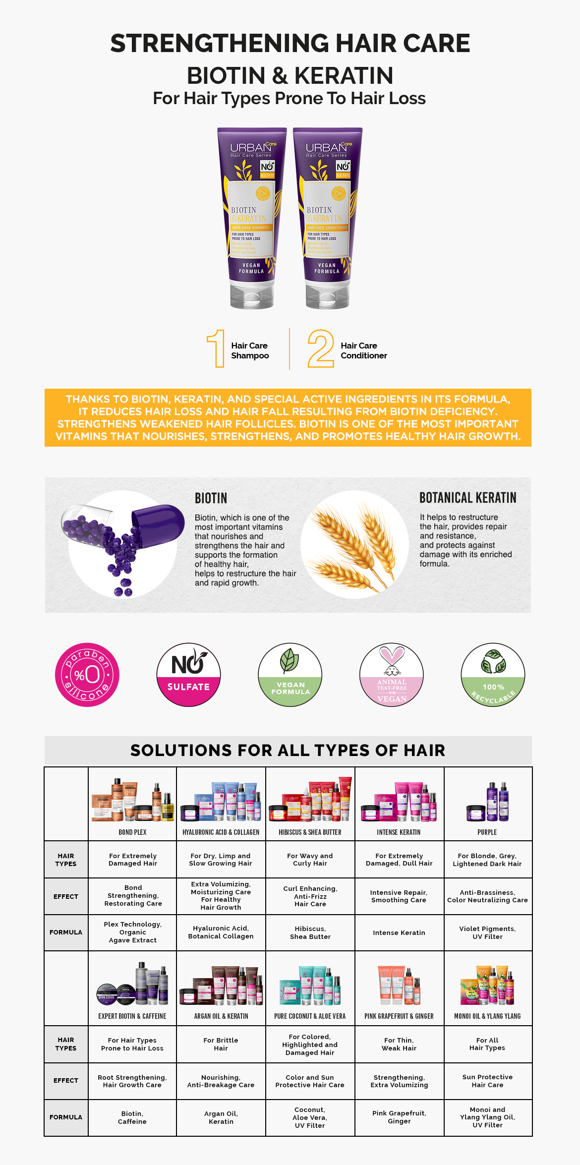 Biotin & Keratin Anti-Hair Loss Hair Care Conditioner die een gezonde haargroei bevordert, is ontwikkeld voor alle soorten zwak haar dat vatbaar is voor uitvallen. De speciaal ontwikkelde formule heeft tot doel haaruitval, haaruitval, verzwakte haarwortels en roos veroorzaakt door een tekort aan biotine in het haar te voorkomen. Biotine is een van de belangrijkste vitamines die een gezonde haargroei voedt, versterkt en bevordert. Dankzij speciale actieve ingrediënten in de formule helpt het het haar te herstructureren en de haarsterkte te vergroten. Het ondersteunt een gezonde haargroei dankzij de versterkende werking. Het helpt het haar te herstructureren en biedt het haar bescherming, herstel en weerstand tegen beschadiging.