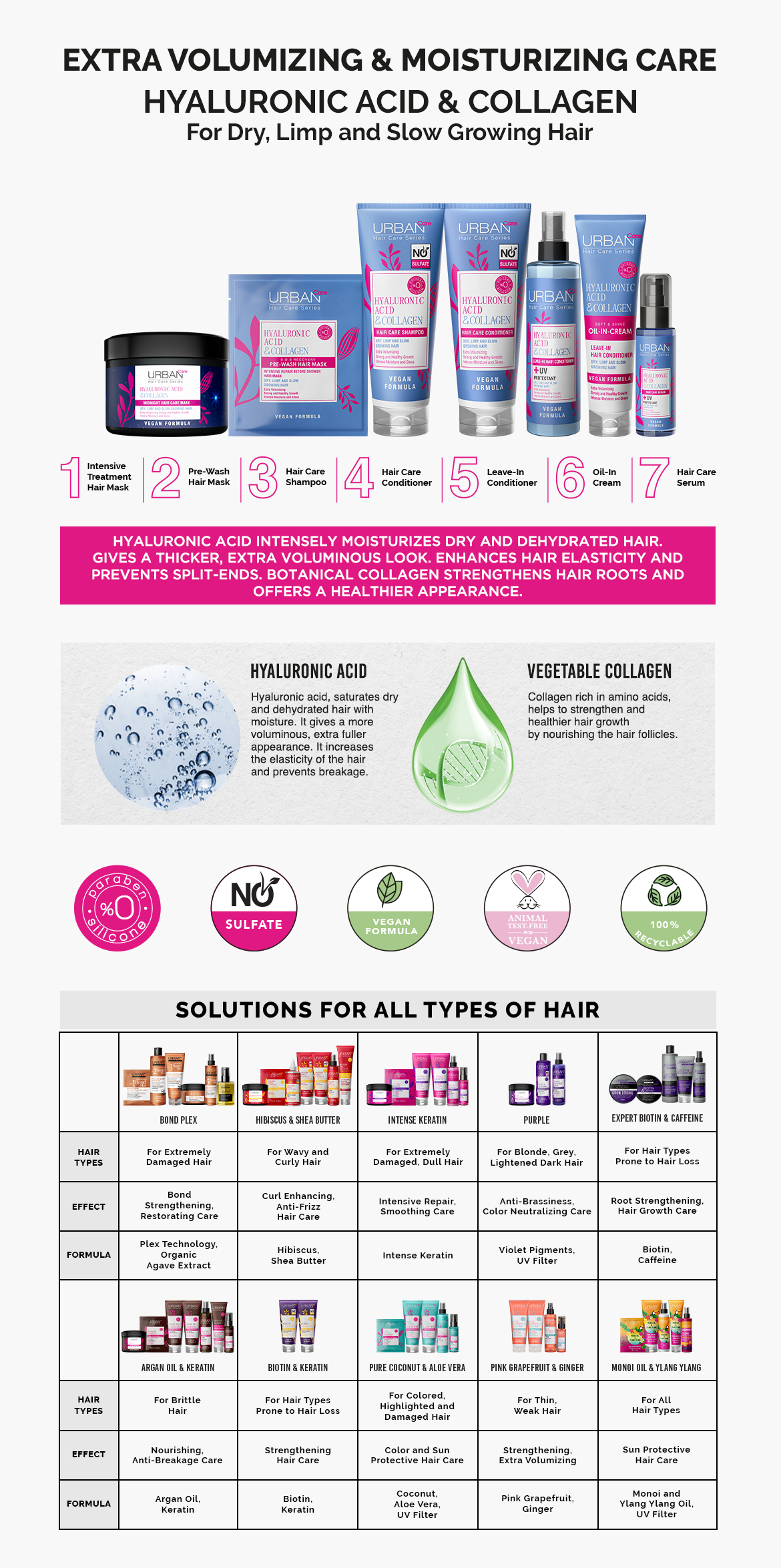 Hyaluronzuur & Collageen Extra Volumizing Oil-In-Cream Leave-In Conditioner ontwikkeld voor dof, futloos, slap en beschadigd haar om er dikker, gladder, volumineuzer, gezond, sterk en glanzend uit te zien. Het hyaluronzuur in de formule dringt diep door in de haarvezels om de hydratatie te leveren. Zorgt voor zijdezachte zachtheid en is gemakkelijk doorkambaar. Het verzwaart het haar niet.
