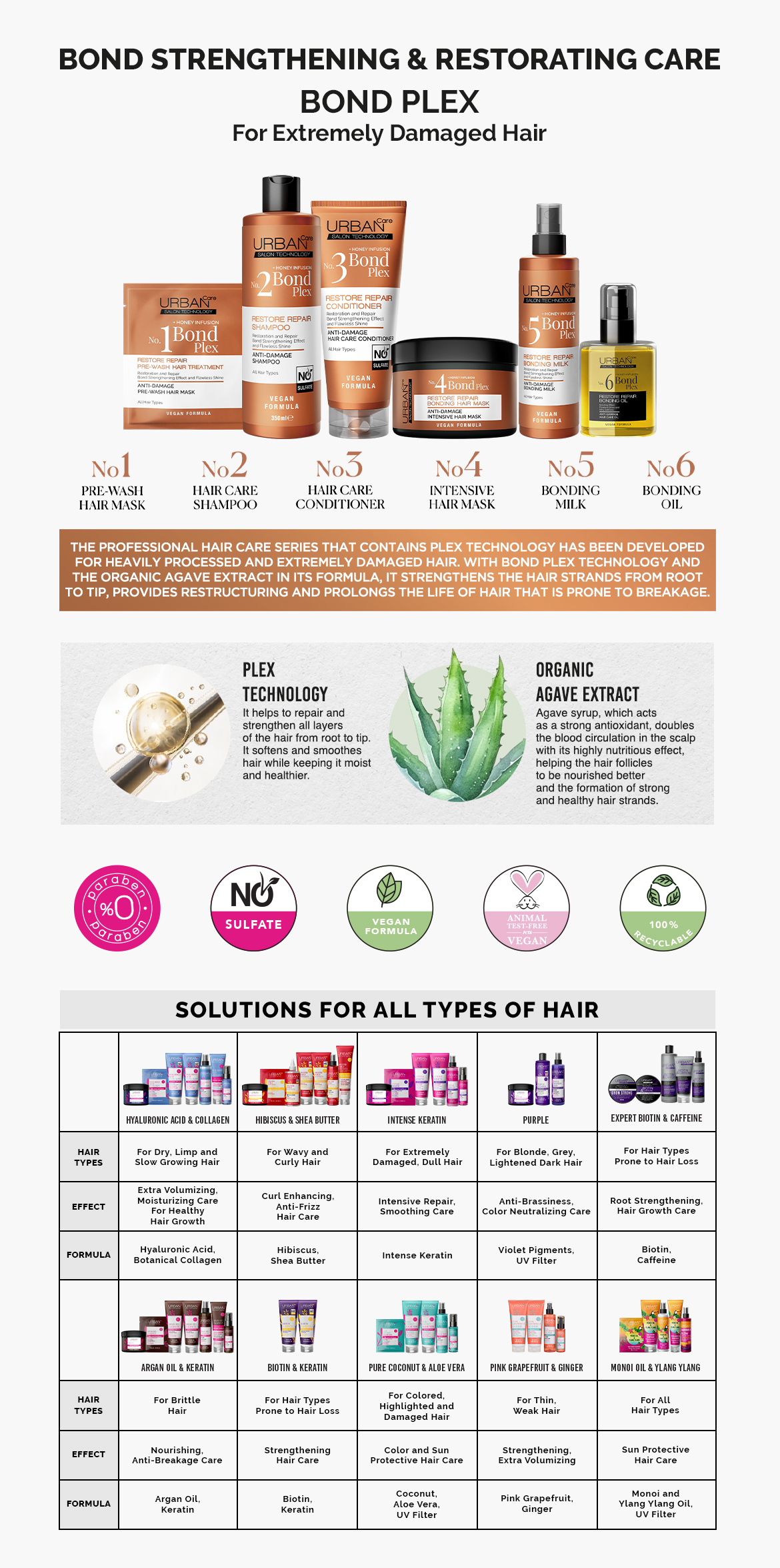 Urban Care Bond Plex Pre-Wash Haarmasker ondersteunt de haarstructuur, dringt door in de haarlokken en helpt je haar te herstellen en te herstructureren zonder het te verzwaren. De speciaal ontwikkelde formule, ondersteund door veganistische honing, hydrateert je haar en zorgt ervoor dat het er zacht en glanzend uitziet. Wanneer gebroken haarverbindingen worden gerepareerd door de bindingsversterkende inhoud van de Bond Plex Series, behouden ze vocht en de voedende werking van veganistische honing en helpen ze voorkomen dat de haarkleur vervaagt. Bond Plex Series helpt het beschadigde haar te herstellen, kroeshaar te verwijderen en de haarelasticiteit te verbeteren. Dankzij de coatingtechnologie verlengt het de levensduur van extreem beschadigd, breukgevoelig haar en versterkt het de haarlokken zonder het te verzwaren. Het bedekt de haarschubben en gespleten punten en ondersteunt de bescherming van het haar vóór hittestyling.