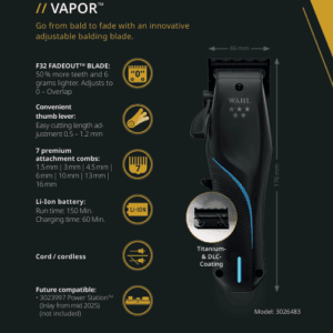 Maak kennis met de Wahl Vapor tondeuse! De Wahl Vapor is voorzien van een krachtige motor in combinatie met het nieuwe, gepatenteerde F32 FADEOUT-snijmes voor snelle en nauwkeurige resultaten.
