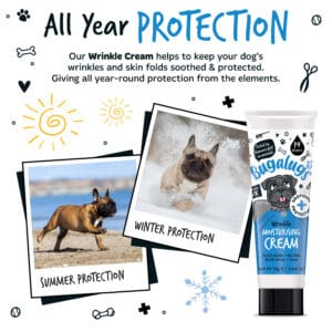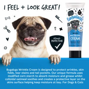 Bugalugs Wrinkle Moisturizing Cream – speciaal ontworpen voor rassen met een plat gezicht, om hun schattige rimpels en huidplooien te beschermen en te verzachten. Deze geavanceerde crème is vakkundig geformuleerd om vocht en vet effectief te absorberen en optimaal comfort te bieden aan uw harige vriend.